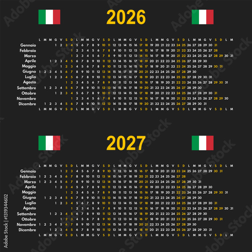 2026 2027 linear calendar, 12 months wall or desk planner with each month in row, vector template, italian month names, black background whole year office timeline