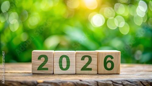 2026 new year number on the wooden cube with a green background represents environmental protection, achieving business goals, and success. saving the environment and environmental sustainability.