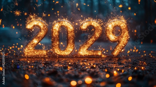 2029 Number Surrounded by Golden Stars and Fireworks. Generative AI
