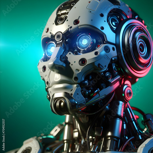 2090's future robot portrait, studio light, on an emerald colored background