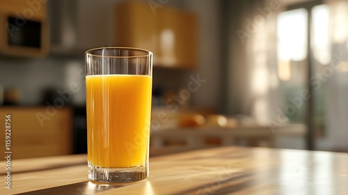 21. A drinking glass filled with orange juice on a breakfast table with a blurred kitchen in the background