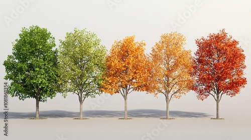 21.A set of realistic trees showcasing the seasonal change from spring to autumn, with vibrant green leaves transitioning into warm orange and red foliage. The trees stand tall, displaying the