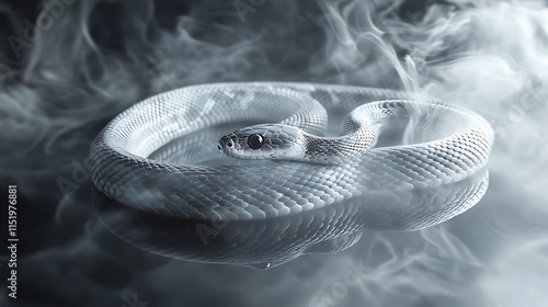 24. A silver snake coiled on a reflective surface surrounded by wisps of soft mist