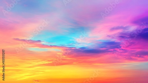 2408 119.A breathtaking sunset scene with a vibrant gradient of colors, transitioning from fiery orange and pink near the horizon to soft purples and blues in the upper sky. The scattered clouds