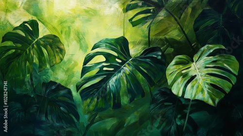 2408 24.A serene view of philodendron leaves in a natural setting, with their deep green hues and glossy surfaces reflecting the light. The veins on the leaves are clearly visible, adding detail and