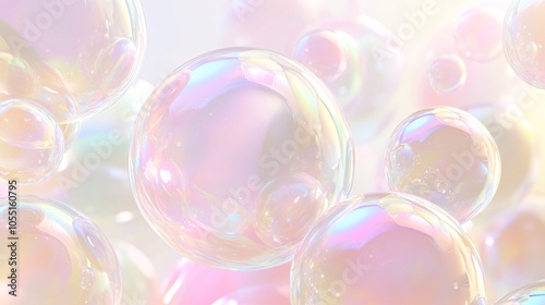 2410 110.A 3D-rendered image of transparent bubbles in various sizes floating in the air. The bubbles reflect light in soft, rainbow colors, with smooth, curved surfaces that create a playful and