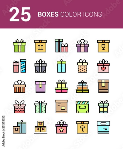 25 Color vector box icons with ribbons for web site and mobile design. Package, gift, present, happy birthday, party box icons set
