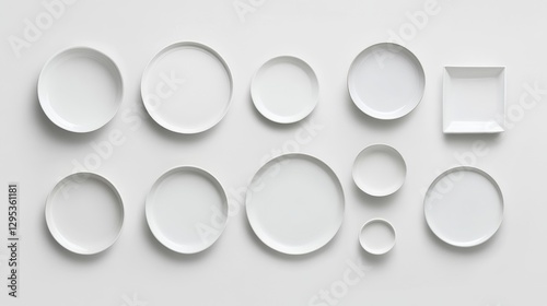 2.A flat lay of various ceramic plates and bowls in minimalist designs, arranged on a pure white background, showcasing clean lines and smooth textures.