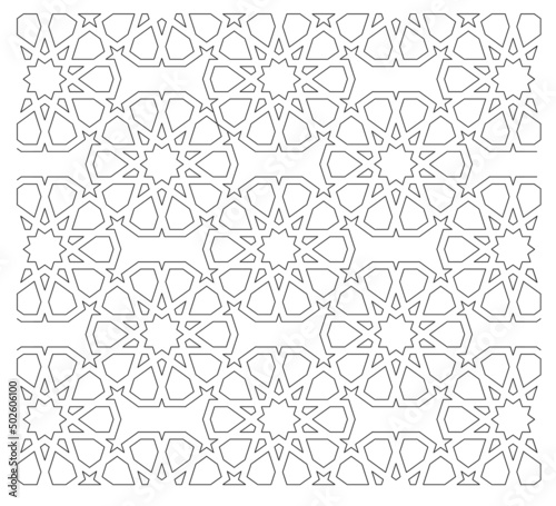 2D CAD drawing of Islamic geometric pattern. Islamic patterns use elements of geometry that are repeated in their designs. The pattern is drawn in black and white.