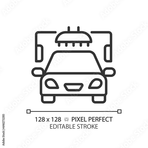 2D pixel perfect editable black car wash icon, isolated vector, thin line simple illustration representing car service and repair.