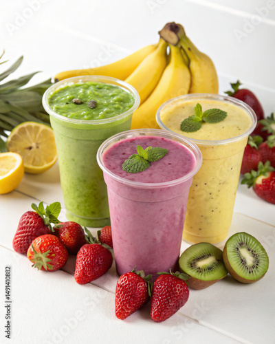 3 smoothies in a plastic cup with fruits around it