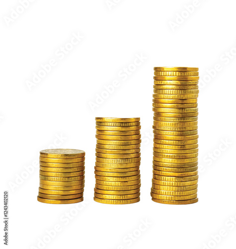 3 stacks of gold coins arranged in ascending order from left to right. The stacks increase in height, symbolizing growth or progress.