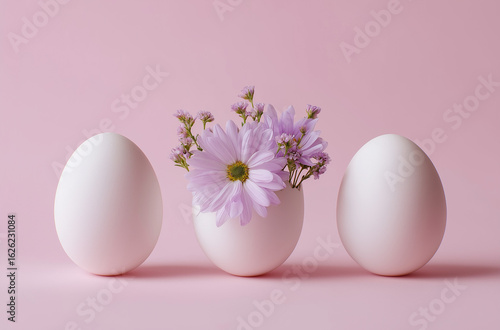 3 white eggs, one egg has small flowers inside it, minimalistic, flower