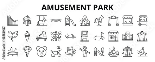 30 Amusement Park Line Icons Vector - Water Slide, Roller Coaster, Swing Ride, Trampoline, Skydiving, Log Flume