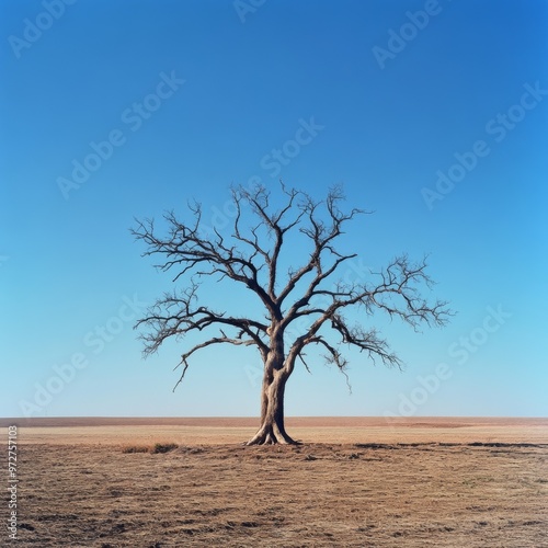 30. An old, withered tree standing alone in a vast empty field, [endurance], [loneliness over time]