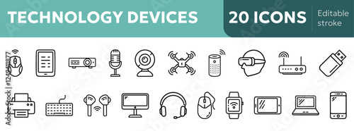 30+ technology device icons including smartphone, laptop, tablet, smartwatch, headphones, printer, keyboard, mouse, VR headset, drone, perfect for tech apps, websites and presentations
