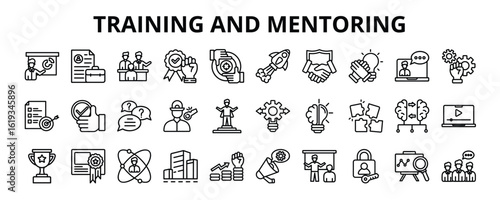 30 Training and Mentoring Line Icons Vector - training, internship, mentorship, motivation, support, coaching, tutorial