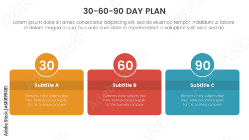 30-60-90 day plan management infographic 3 point stage template with box and circle badge horizontal concept for slide presentation vector