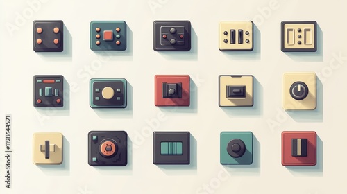 33.A collection of toggle switches in flat design style, showcasing various states and positions, including active and inactive modes, rendered with minimalist shadows on a clean background.