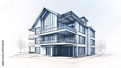 34. House building sketch architectural 3d illustration. Artistic rendering of a residential building, combining traditional and modern architectural styles.