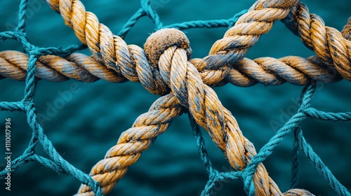 34.Detailed view of fishing nets crisscrossed by heavy-duty industrial ropes, with visible wear and tear on both elements. The ropes are thick, coarse, and aged, intertwined with the delicate,