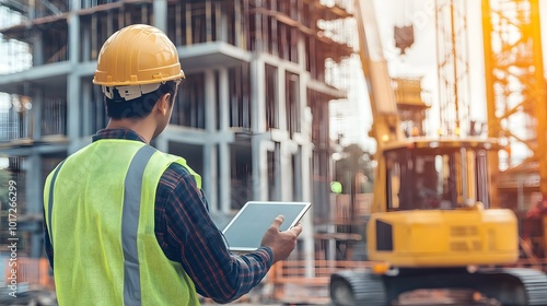 36. A construction supervisor using a tablet to monitor progress on-site, surrounded by machinery