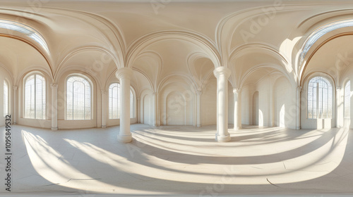 360 degree panorama view.A peaceful, light-filled space. A 3D rendering shows a calming, all-around view, perfect for virtual reality.