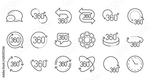360 degrees line icons. Rotate arrow, VR panoramic simulation and augmented reality. 360 degrees virtual gaming, abstract geometry, full rotation view icons. Linear set. Quality line set. Vector
