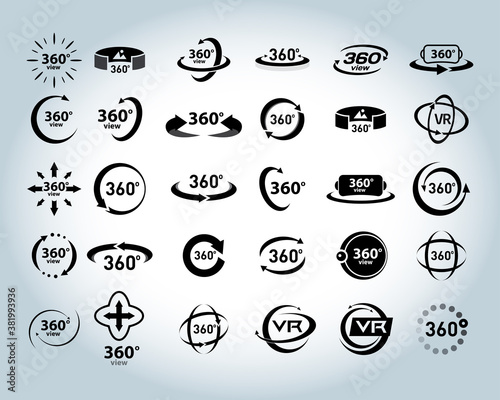 360 Degrees View Vector Icons set. Virtual reality icons. Isolated vector illustrations. Black and white version.