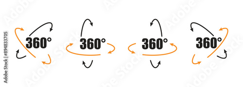360-degree set of icons, in black and orange colors, 360-degree viewing angle, virtual reality.