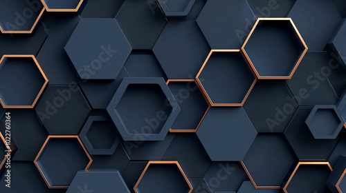 3D abstract background featuring a pattern of interconnected hexagonal shapes in dark and gold tones