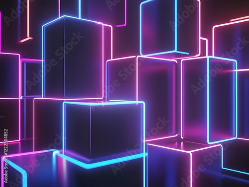 3D Abstract Shapes with Neon Lights Forming a Grid Pattern in Vibrant Pink and Blue Colors, Futuristic Digital Background with a Tech Aesthetic