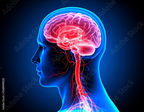 3D anatomical illustration of a human brain and nervous system
