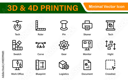 3D and 4D Printing Icons – Outline, Vector, and Line Art Illustrations for Printing Tech, Prototyping, Design, Engineering, and Innovation Projects