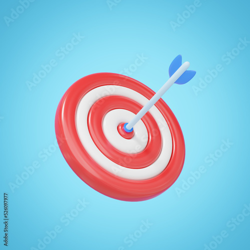 3d arrows in red bullseye isolated on blue background. Target landing web page. Business finance, Marketing goal success, target achievement concept. cartoon icon minimal. 3d render with clipping path