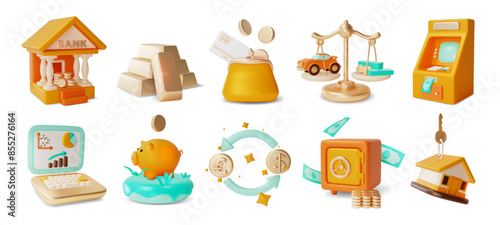 3d Banking Concept Set Cartoon Design Style Include of Bank Building, Safe Box and Purse Wallet. Vector illustration