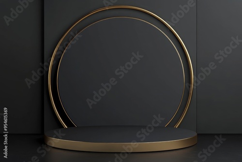3D black round corner pedestal podium background with golden ring and semi circle wall scene. with generative ai