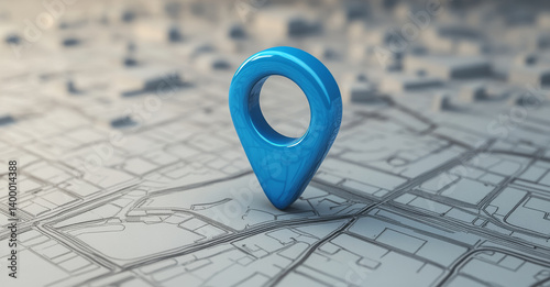 3D blue location pin icon stands prominently on detailed city map, symbolizing navigation and direction. map features streets and buildings, creating sense of urban planning