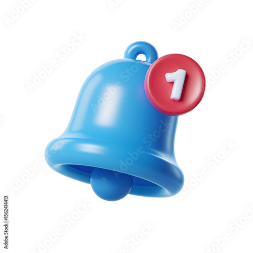 3d blue notification bell icon showing one alert badge isolated on transparent background.