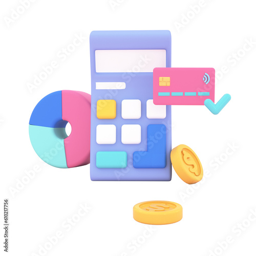 3d calculator, coins, credit card and pie chart. Payment processing, analyzing budget, managing financial income, online payment and money saving concept. 3d render illustartion.