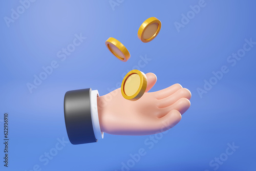 3D cartoon business man hand with black wrist holding coin on blue background ,3D rendering flying money on hand ,Business man throwing money concept