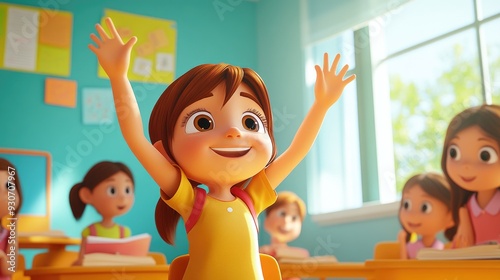 3D Cartoon Classroom Adventure Curious Girl with Raised Hands in Learning Questions and Discovery with a Friendly Teacher and Classmates Exploring Knowledge Together