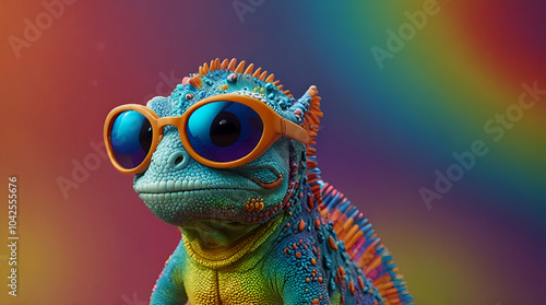 3d cartoon colorful chameleon wearing sunglasses on colorful background, Gnerative.ai