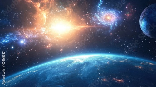 3D cartoon depiction of stars in a planet and galaxy within open space