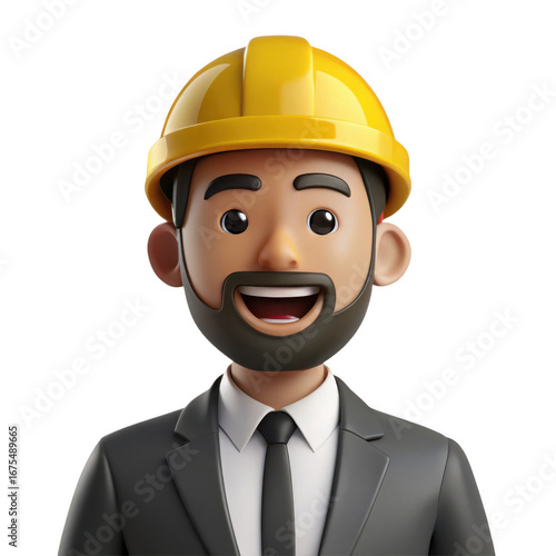 3d cartoon engineer character with yellow hard hat isolated on transparent background
