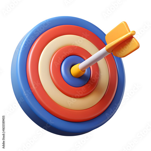 3D Cartoon Plastic Style Dart Arrow Hitting Target Dartboard Icon Isolated on White Background