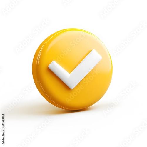 3d check icon, checklist tick, done mark. Vector realistic plastic style checkmark, symbol of selection, confirmation or approval. yellow circle with a white, white background