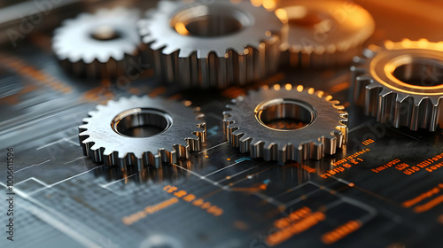 3D Close-Up of Interlocking Gears with Holographic Financial Data Overlay on Isolated White Background - Symbolizing Teamwork and Financial Growth