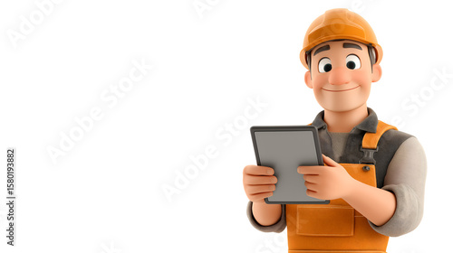 3D construction worker holding digital tablet wearing safety helmet and uniform on white background
