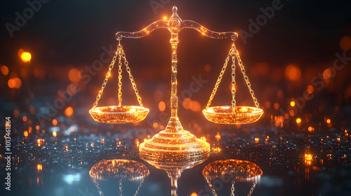 3D Digital Glowing Scales of Justice for Human Rights Day - Abstract Representation of Equality Against Dark Futuristic Background